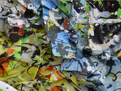 découper, déchirer en petits morceaux, en lanières, pour coller, marouller, de manière à créer des fractions d'univers en soi, exprimant le frémissement des mouvements élémentaires. Cela peut devenir des tableaux atteignant 200 x 160 cm, ou bien de petits formats. Il colle ces papiers très fins sur différents supports - cela peut être une assiette en carton, de la porcelaine, un pot de fleur, ou bien même une sculpture africaine (une copie, bien sûr). N'oublions jamais. chez jean Schottmann, une ironie critique fondamentale, qui peut d'ailleurs donner naissance à des travaux plus «difficiles»,