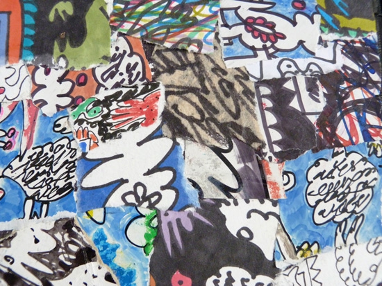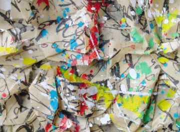 Son travail commence a la papeterie, où il acquiert des papiers japon, principalement, et puis des bristols, des cartons. ll va d'abord écrire dessus, d'une écriture spontanée, faite de signes et de personnages plus ou moins figuratifs, et puis il va froisser le tout,